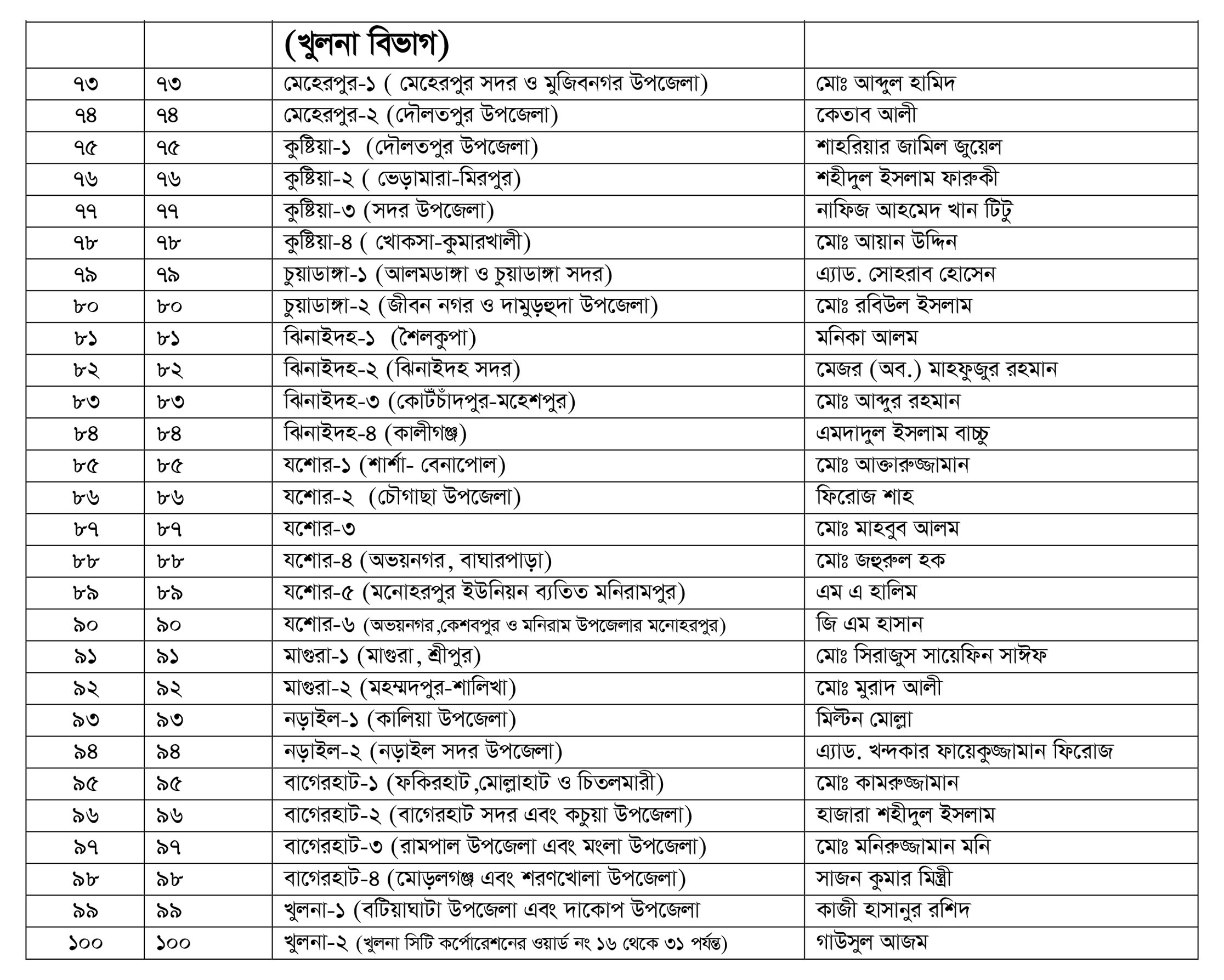 আজ (২৭ নভেম্বর) সোমবার সন্ধ্যায় রাজধানীর বনানীতে অবস্থিত জাতীয় পার্টির চেয়ারম্যান কার্যালয়ে আনুষ্ঠানিকভাবে প্রার্থীদের নাম ঘোষণা করেন দলটির মহাসচিব মুজিবুল হক চুন্নু।
