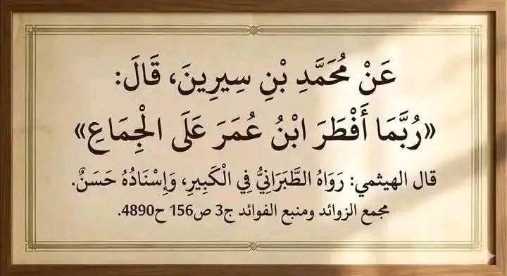 عَنْ مُحَمَّدِ بْنِ سِيرِينَ، قَالَ: «رُبَّمَا أَفْطَرَ ابْنُ عُمَرَ عَلَى الْجِمَاعِ قال الهيثمي: رَوَاهُ الطَّبَرَانِيُّ فِي الْكَبِيرِ، وَإِسْنَادُهُ حَسَنٌ. مجمع الزوائد ومنبع الفوائد ج 3 ص 156 ح 4890.